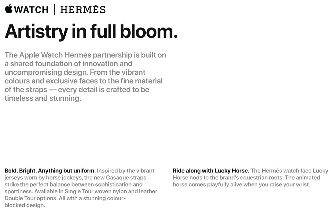 The Apple Watch Hermès partnership is built on a shared foundation of innovation and uncompromising design. From the vibrant colours and exclusive faces to the fine material of the straps — every detail is crafted to be timeless and stunning.