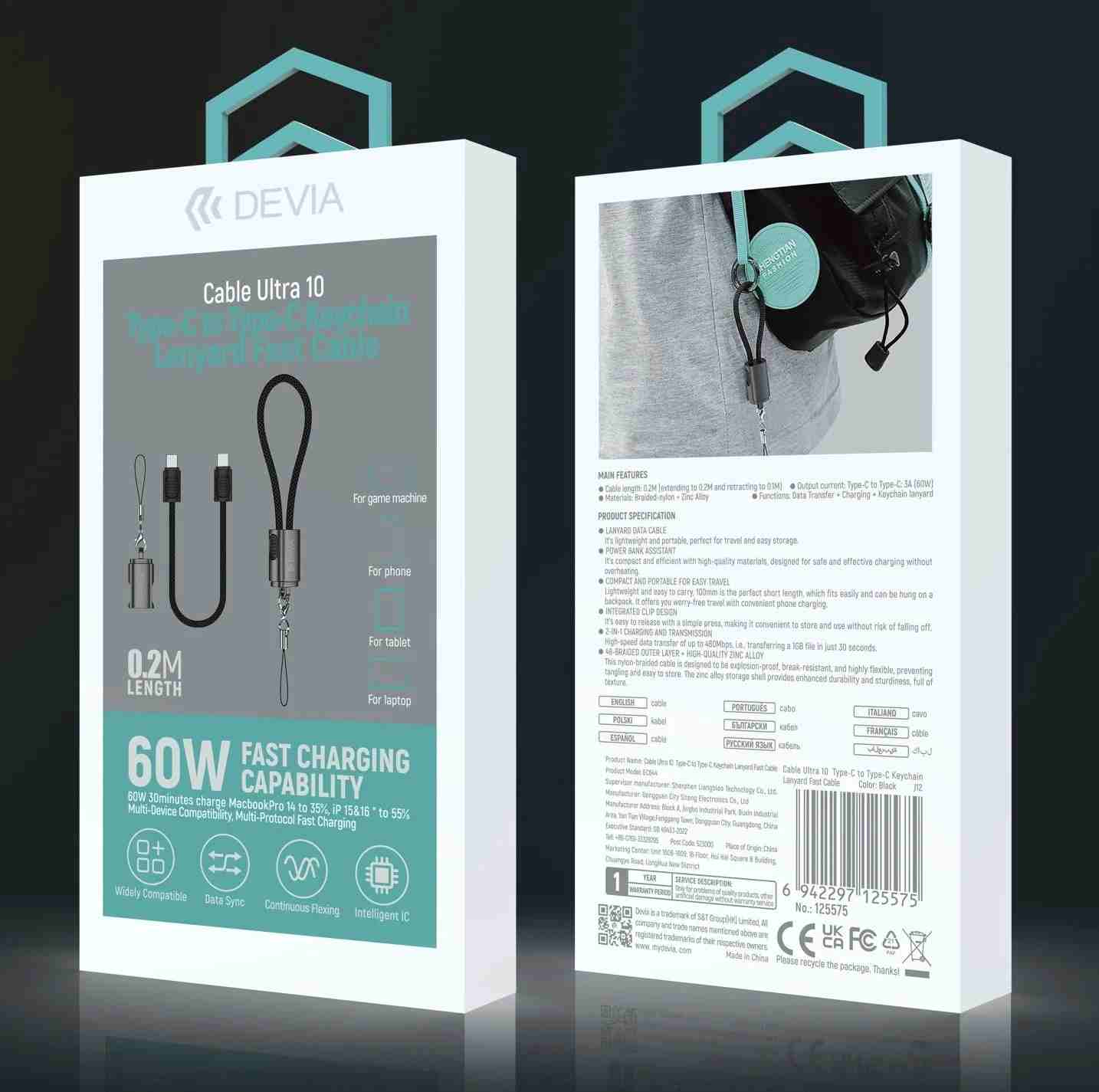 DEVIA Cable Ultra10 Type-C to Type-C Keychain Lanyard Fast Cable (0.2M) - Black