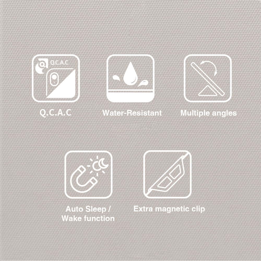 • Quick Camera Access Corner [Q.C.A.C] • Auto Sleep / Wake Function • Extra Magnetic Clip • Water-resistant • Multiple Angles